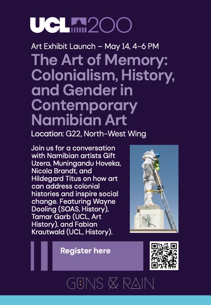 Based on a generous loan from Johannesburg- and London-based gallery Guns & Rain, I’m organizing the launch of a small, public exhibit of contemporary Namibian art at University College London on May 14. If you’re interested, feel free to reach out to me you have any questions. You can register here and via the QR code below: